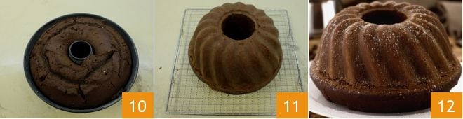 Una vez que hayáis incorporado y mezclado bien los ingredientes, podéis pasar a disolver el café soluble en la leche a temperatura ambiente o ligeramente tibia 7. Removéis con una cucharilla hasta la completa disolución del café, luego incorporadlo en un hilo al resto de la mezcla en la batidora 8. Mezclad todo continuando haciendo funcionar las varillas hasta obtener una mezcla densa y homogénea. Luego engrasad y enharinad un molde de rosquilla de 22 cm de diámetro y 10 cm de profundidad y verted la mezcla en su interior 9, nivelándola con la ayuda de una espátula. Colocad el dulce a cocinar en horno estático precalentado a 180° durante 50 minutos (si es horno ventilado a 160° durante 40-45 minutos).