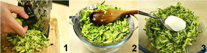 Para preparar el rollo de crepes con calabacines, comienza lavando, cortando los extremos y rallando los calabacines con un rallador de agujeros grandes 1; luego exprímelos bien ayudándote con un colador 2 y colócalos en un bol. Añade entonces el queso Philadelphia 3 y la bechamel que habrás preparado con las cantidades indicadas arriba y siguiendo el procedimiento que encuentras Bechamel
