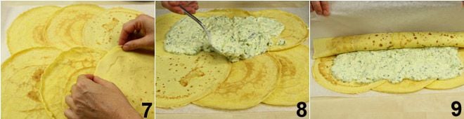 Sobre un papel de horno engrasado coloca las crepes superponiéndolas un poco para formar un rectángulo 7, unta la mezcla de calabacines y Philadelphia en el centro del rectángulo 8 y enrolla las crepes ayudándote con el papel de horno 9