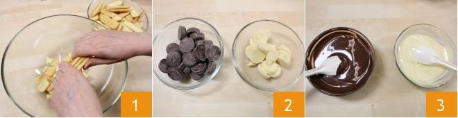 Para preparar el salami de dos chocolates, comenzad preparando el compuesto de chocolate blanco que serviréis para realizar el corazón del salami. Romped groseramente 100 g de galletas secas (o Pavesini) con las manos y reservadlas 1. Luego, derretid por separado en el microondas o al baño maría el chocolate negro y el blanco y reservadlos (2-3).