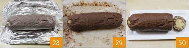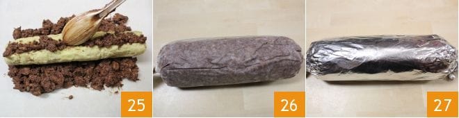 que colocaréis en el centro del compuesto de chocolate negro 25. Cubrid con una parte de la masa de chocolate y compactad el compuesto alrededor del corazón dándole forma de salchichón. Envolved el salami primero en el papel de horno de manera apretada formando como si fuera un caramelo 26 y luego en el papel de aluminio 27 para que quede bien presionado y ponedlo a enfriar en el frigorífico durante 2-3 horas.