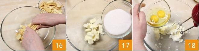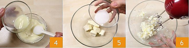 Añadid al chocolate blanco derretido la leche condensada calentada con la nata 4, y mezclad bien, dejad que se temple a temperatura ambiente. Si el compuesto obtenido fuese demasiado denso, añadid un par de cucharadas de nata caliente. En otro bol, poned la mantequilla ablandada a temperatura ambiente y el azúcar 5, poned en marcha la batidora eléctrica y batid todo para obtener una mezcla cremosa 6.