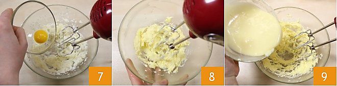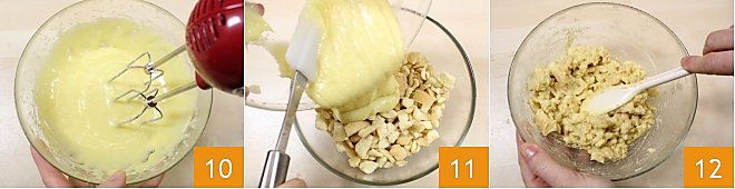 Luego añadid la yema 7 y continuad batiendo, cuando obtengáis un compuesto blanco y espumoso 8 añadid el chocolate blanco junto con la leche condensada ya tibia 9, y continuad batiendo.