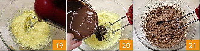 y batid nuevamente para incorporarlos, y cuando hayáis obtenido un compuesto blanco y espumoso 19 añadid el chocolate negro derretido previamente ya tibio 20 y trabajad el compuesto hasta tener una consistencia homogénea 21.