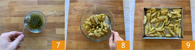 Agregad también la pimienta negra y mezclad 7. Verted las patatas en un bol y rociadlas con la emulsión recién preparada 8. Transferidlas a una bandeja de horno forrada con papel de horno 9 y horneadlas en el horno estático precalentado a 200° durante 20 minutos.