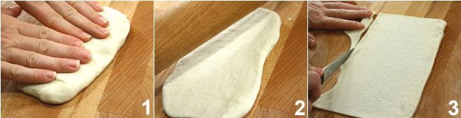 Para preparar las salchichas en camisa, comenzad dividiendo la masa fermentada en 4 partes iguales (50 gr por cada pieza) 1, luego estiradla con un rodillo hasta formar un rectángulo 2 que pueda envolver completamente la salchicha, la cual daréis mejor forma con un cuchillo pequeño 3.