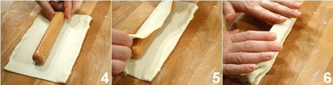 Colocad la salchicha en el centro del rectángulo de masa 4 y envolvedla completamente a modo de caramelo (5-6).