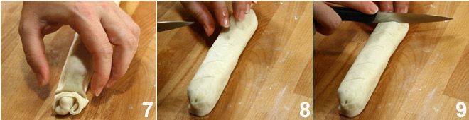 Quitad el exceso de masa de los lados 7 y con un cuchillo afilado, haced cortes transversales en la superficie de la masa 8. Proceded de esta manera con las 4 salchichas 9. Encended el horno y llevadlo a una temperatura de 200° C, luego forrad una bandeja con papel de horno y colocad en ella las 4 salchichas en camisa; hornead y coced durante unos 10 minutos, luego servid todavía caliente.