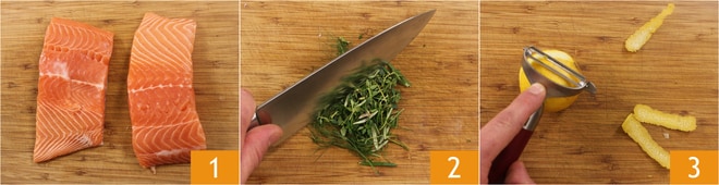 Para preparar el salmón al vapor, comienza quitando la piel y las espinas 1, o pide a tu pescadero que te prepare 2 filetes iguales sin espinas y sin piel. Pica finamente las hierbas juntas 2, reservando solo las hojas de laurel y una rama de romero. Pela el limón con un pelador, guarda las rodajas de cáscara 3 y exprime el jugo.