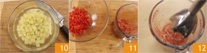 Pela y corta la patata, luego colócala en un bol con agua para que no se ponga negra 10. Finalmente, corta los tomates cherry en cuartos, elimina la pulpa y las semillas que triturarás con la ayuda de una batidora de inmersión, y corta los gajos en cubitos 11 12.