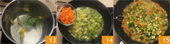 Pon al fuego una olla grande de agua, sobre la cual colocarás la cesta para la cocción al vapor, y prepara un agua aromatizada con la cáscara de limón, las hojas de laurel y la ramita de romero 13, luego sube el fuego y lleva el agua a 80°-90°. Continúa con las verduras: calienta en una sartén 3 cucharadas de aceite de oliva virgen extra y sofríe la cebolla a fuego medio-bajo. Apenas empiece a chisporrotear, añade medio vaso de agua, sala ligeramente y cuando el líquido se haya evaporado casi por completo, añade los dados de patatas, el apio, el pimiento y las zanahorias 14. Cocina durante 10 minutos a fuego medio, dorando ligeramente las patatas. Si la preparación se seca demasiado, añade medio vaso de agua. Agrega los calabacines picados y el resto de hierbas picadas 15, sala, añade pimienta y cocina otros 10 minutos.