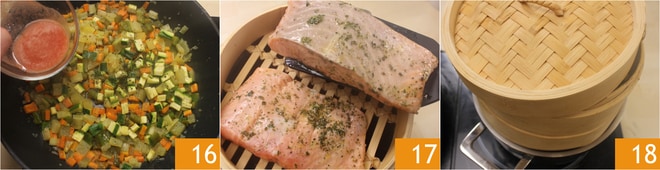 Finalmente, añade el jugo de los tomates cherry triturado 16 y los cubitos de tomates cherry; cocina otros 10 minutos asegurándote de que todas las verduras estén bien cocidas. Coloca la cesta sobre la olla; retira los filetes de salmón de la marinada y colócalos en la cesta 17. Cocina el pescado dentro de la cesta con la tapa durante 8-9 minutos aproximadamente (si los filetes son muy gruesos, aumenta el tiempo de cocción), teniendo cuidado de mantener durante toda la cocción una temperatura de ebullición suave, de lo contrario, los trozos de pescado se desmoronarán excesivamente 18. Emplata el filete de salmón al vapor con las verduras alrededor y sirve.