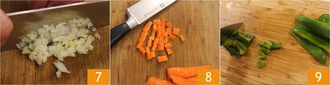 Mientras tanto, pica finamente la cebolla 7 y comienza a cortar las verduras en dados más o menos iguales, de aproximadamente medio cm: pela y corta la zanahoria 8, los calabacines y el apio, después de haber eliminado los filamentos. Corta en cuartos el pimiento verde, quita las semillas internas y los filamentos blancos, pela la piel externa y redúcelo también a cubitos 9.
