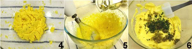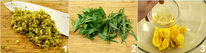 Para preparar la salsa tártara empieza cociendo 4 huevos. Mientras tanto, pica finamente con un cuchillo los pepinillos y las alcaparras 1, pica también el perejil y el estragón 2. Separa las yemas cocidas de los huevos y colócalas en un bol, añade el vinagre de vino blanco 3, una buena pizca de sal y una molienda de pimienta negra.