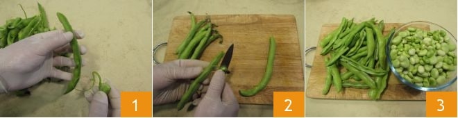 Para el salteado de cáscaras de habas, comenzad poniendo una olla con agua al fuego donde luego blanquearéis las cáscaras, después pasad a la limpieza de las vainas quitándoles el filamento central con la ayuda de un cuchillito 1; quitad los dos extremos 2 y haced lo mismo con todas y mantenedlas separadas de las habas 3, que podríais utilizar para otras recetas, como por ejemplo la ensalada de habas. Si lo preferís, podéis usar guantes para limpiar las habas, de esta manera evitaréis que residuos de tierra terminen bajo vuestras uñas.
