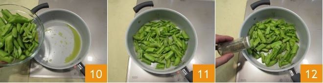 cuando el aceite esté bien caliente, retirad el ajo y verted las cáscaras cortadas 10, dejándolas sazonar por unos minutos a fuego vivo 11 y ajustad de sal y pimienta 12.