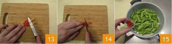 Mientras tanto, cortad un chile, quitadle las semillas internas 13, luego cortadlo en tiras 14 y añadidlas a las cáscaras de habas 15.