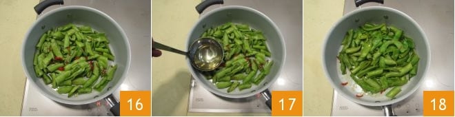 Dejad cocinar aún a fuego vivo por un instante 16 y luego desglasad con un cucharón del líquido de cocción de las habas que habéis reservado (si lo preferís, podríais añadir Caldo de verduras en sustitución) 17 y dejad cocinar por otros 10 minutos hasta que el salteado de cáscaras de habas esté bien seco 18.