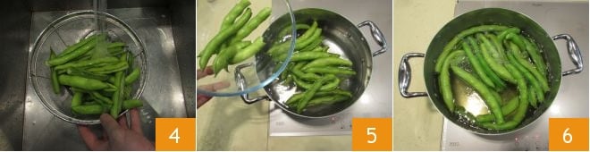 Enjuagad bajo agua corriente las vainas de las habas para eliminar posibles impurezas 4, luego sumergidlas en el agua hirviendo 5, dejándolas cocinar durante 5 minutos 6, justo el tiempo necesario para ablandarlas ligeramente. Conservad el líquido de cocción que os servirá posteriormente para desglasar las cáscaras.