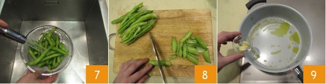 Pasados los 5 minutos, escurrid las cáscaras y enjuagadlas bajo agua fría para detener la cocción 7; escurridlas, ponedlas sobre una tabla de cortar y cortadlas en forma de rombos dividiendo las vainas en 3-4 piezas dependiendo de la longitud 8. Si preferís un aroma menos intenso de ajo, cortadlo por la mitad y quitadle el germen, luego vertedlo en una cacerola junto con el aceite dejándolo sazonar por un instante 9;
