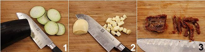Para preparar las tostas con berenjenas, scamorza y tomates secos, primero lava la berenjena y córtala en rodajas redondas bastante finas 1. Corta la scamorza en pequeños cubitos 2 y termina cortando en tiras los tomates secos 3.