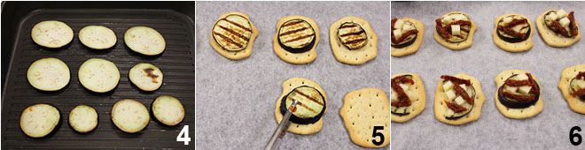 Ahora calienta una parrilla de hierro fundido y asa las berenjenas por ambos lados 4; mientras tanto, coloca las 12 tostas en una bandeja cubierta con un papel de horno. Una vez listas, sala ligeramente las berenjenas y coloca una rodaja sobre cada tosta (si la rodaja resulta demasiado grande, córtala por la mitad) 5. Condimenta cada tosta con 3-4 cubitos de scamorza y algunas tiras de tomate seco 6 y hornéalas a 180° durante unos 5 minutos, hasta que la scamorza se haya derretido. ¡Completa los aperitivos colocando una hojita de albahaca sobre cada tosta con berenjenas, scamorza y tomates secos!