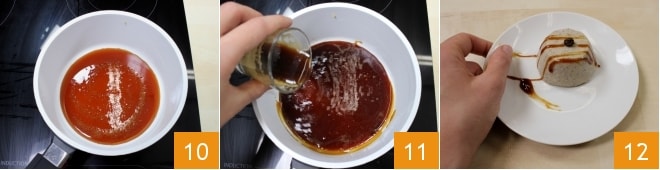 hasta que haya alcanzado un color ámbar 10. En este punto, incorpore 90 gr de café espresso 11, siempre a fuego bajo, y continúe mezclando para amalgamar todo. Tan pronto como haya obtenido una mezcla suave y fluida, apague el fuego y déjelo enfriar, mezclando de vez en cuando. Cuando sus semifríos estén listos, sáquelos del frigorífico y, para extraerlos de los moldes con mayor facilidad, sumérjalos durante unos segundos en agua caliente, luego voltee sobre un plato y extraiga. Para finalizar, adorne los postres con el caramelo al café y, si lo desea, con algunos granos de café tostado (o, si los encuentra, con granos de café de chocolate) 12.