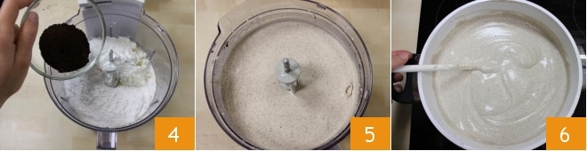 y el polvo de café 4, luego mezcle todo durante unos minutos hasta obtener una mezcla cremosa 5. Vierta la mezcla obtenida en una cacerola, colóquela a fuego lento y déjela calentar lentamente 6.
