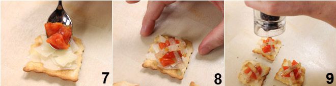 poned encima una cucharada de tomatitos salteados 7 y finalmente un par de tiras de guanciale dorado 8. Condimentad todos los hojaldres de esta manera y terminad con una generosa molienda de pimienta negra 9: ¡aquí están listos los hojaldres clásicos amatriciana!