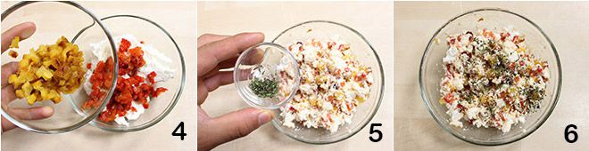 Poned la ricotta en un bol y añadid los pimientos en daditos 4, luego picad finamente la ajedrea y añadidla a la mezcla 5, reservando siempre algunas hojitas para la decoración final. Mezclad bien con un tenedor para amalgamar todos los ingredientes y ajustad de sal 6.