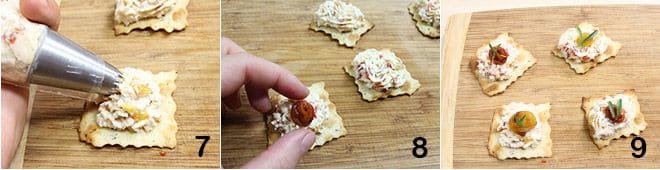 En este punto, trasladad la mezcla a una manga pastelera con boquilla estrellada y empezad a componer los hojaldres exprimiendo un copo de crema de ricotta y pimientos asados sobre cada hojaldre 7, luego colocad en el centro una tira de pimiento enrollada 8 y finalmente algunas hojitas de ajedrea sobre cada pimiento 9.
