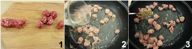 Para preparar las hojaldres con salchicha crujiente y stracchino empieza reduciendo la salchicha en pequeños cubitos 1. En un cazo calienta el aceite y sofríe la salchicha. Cuando empiece a tomar color, añade el vino 2 y agrega las semillas de hinojo 3,