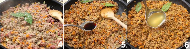 Añade también el laurel y las hojas de tomillo 4. Luego incorpora el concentrado de tomate, mezcla y añade la salsa Worcestershire 5 y el caldo 6. Lleva a ebullición y deja hervir a fuego lento por unos 45 minutos, hasta obtener la consistencia de una salsa densa (tipo ragú).