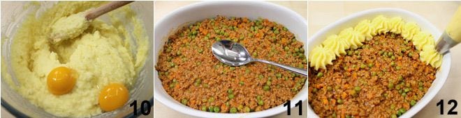 las yemas 10, sal, pimienta y nuez moscada y mezcla bien los ingredientes. En este punto coloca la salsa de carne y guisantes en una fuente para horno y nivélala con una cuchara 11. Luego pon el puré en una manga pastelera con boquilla dentada y realiza copos de patatas sobre la carne 12, formando una capa de patatas. Hornea el shepherd's pie durante 30 minutos a 200°C. Los últimos 10 minutos enciende el grill del horno para crear un dorado sobre las patatas. ¡Saca el pastel del horno y déjalo reposar unos diez minutos antes de servirlo!