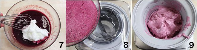 y añádela al preparado de uva fresa, teniendo cuidado de no desmontarla 7; mezcla bien con la ayuda de un batidor hasta obtener una mezcla homogénea. Vierte todo en la heladera 8 y deja mantecar durante al menos 35-40 minutos, o hasta obtener un sorbete cremoso 9. Sirve el sorbete de uva fresa bien frío.