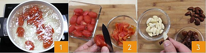 Para preparar los espaguetis con pesto a la trapanese seguid la receta del Pesto alla trapanese. Primero preparad los tomates pelados: poned al fuego una olla grande llena de agua. Lavamos los tomates y hacemos un corte en cruz en la punta de cada tomate. Cuando el agua empiece a hervir, escaldamos los tomates durante 2-3 minutos 1, luego pelamos los tomates 2 y los cortamos en cubos. En este punto pelamos las almendras: las ponemos a escaldar durante unos minutos en agua hirviendo, las escurrimos y bastará una ligera presión con los dedos para quitar la piel 3.