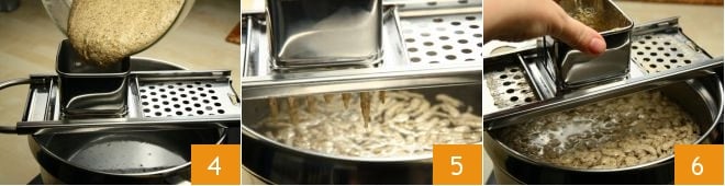 Pon la masa en el aparato adecuado 4 que habrás colocado sobre la olla llena de agua hirviendo y deja que los spätzle caigan en el agua debajo. (5-6)