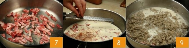 Pon en una sartén la panceta ahumada 7 y déjala dorar a fuego lento para que quede bien dorada y suelte parte de la grasa que contiene: una vez dorada, añade la nata fresca, la pimienta molida 9 y luego, apenas la nata esté a punto de hervir, apaga el fuego.
