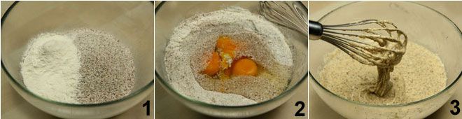 En un bol, vierte la harina 00 1, añade también la de trigo sarraceno, luego agrega los huevos, la sal y el agua: comienza agregando 80 gramos y poco a poco el resto, porque podría ser necesario añadir un poco menos de lo indicado 2, mezcla bien con una batidora hasta obtener una pasta lisa y homogénea 3, que debe resultar densa y desprenderse del cucharón formando grandes gotas (ajusta el agua que añades en consecuencia).