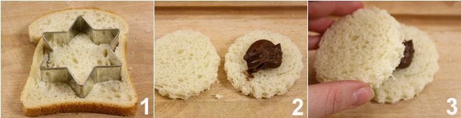 Para preparar las estrellitas de Nutella, comienza cortando el pan de molde con un cortador de galletas en forma de estrella 1. Puedes usar, por supuesto, la forma que prefieras (corazón, flor, círculo). Toma la Nutella que habrás puesto en el frigorífico durante media hora para que se endurezca un poco (alternativamente, ponla en el congelador durante 10-15 minutos) y coloca una cucharadita sobre la forma de pan de molde 2, luego cubre con otra forma 3 presionando ligeramente los bordes. Continúa así con las demás.