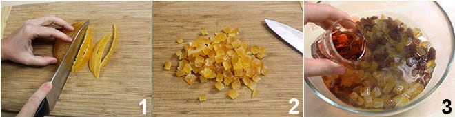 Para preparar el stollen, comienza cortando la naranja confitada en rodajas y reduciéndola a cubos (1-2). Ponla a remojo junto con las pasas en un bol con agua tibia, de manera que todo quede cubierto a ras, y 50 ml de ron tomados de la dosis total 3.