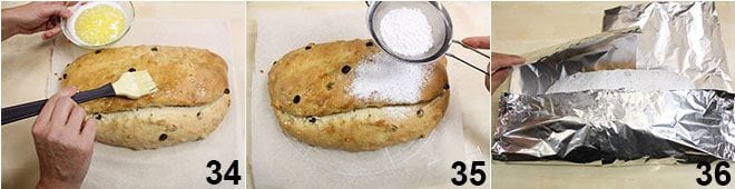 Una vez sacado del horno, unta inmediatamente con la mantequilla derretida 34 y espolvoréalo con abundante azúcar glas tamizado 35, luego déjalo enfriar sobre una rejilla. Envuélvelo después en papel de aluminio y deja reposar el stollen en un lugar fresco (pero no en la nevera) durante un par de días antes de consumirlo, para que absorba humedad y adquiera la consistencia clásica. ¡Buen Stollen y Feliz Navidad a todos!