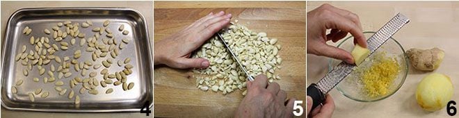 Mientras tanto, coloca las almendras peladas en una bandeja para hornear y tuéstalas en el horno, hasta que estén crujientes pero no demasiado coloreadas 4. Si tienes almendras con piel, escáldalas durante 5 minutos en agua hirviendo y luego retira la piel que se desprenderá fácilmente. Cuando las almendras estén frías, pícalas gruesamente 5 y déjalas aparte. Ralla la cáscara de limón y el jengibre en un bol y resérvalas 6.