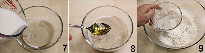 Disuelve la levadura (puedes usar también un cubo de levadura de cerveza fresca desmenuzada) en un poco de leche tibia (tomada de la dosis total de la receta) y agrégale una cucharadita de miel (7-8). Coloca la harina en un bol y haz un hueco en el centro, donde verterás la levadura 9.