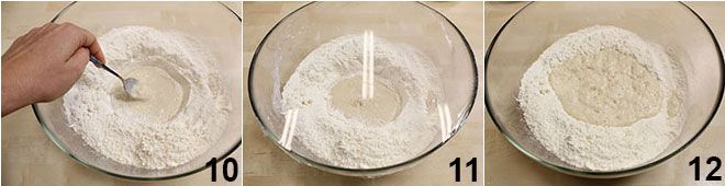 Mezcla con una cucharita, incorporando a la levadura un poco de harina, hasta obtener una mezcla similar a una papilla, que dejarás así en el centro sin amasar 10. Cubre todo con film transparente 11 y deja fermentar durante al menos media hora en un lugar cálido, hasta que la mezcla duplique su volumen inicial 12.