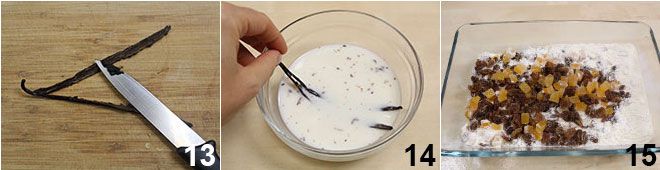 Mientras la papilla fermenta, corta por la mitad una vaina de vainilla y raspa sus semillas internas con la hoja de un cuchillo pequeño 13. Pon la vaina abierta y las semillas en infusión, dentro de un bol que contenga la leche restante que habrás entibiado 14. Luego derrite la mantequilla y déjala enfriar; finalmente, escurre las pasas y la naranja confitada, sécalas con papel de cocina para secarlas, pásalas por harina 15 y luego por un tamiz para eliminar el exceso.