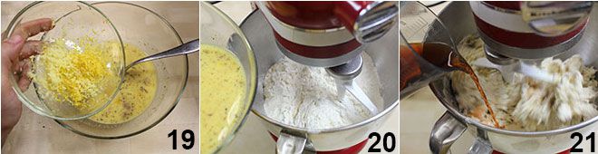 la cáscara de limón y el jengibre rallados 19. Vierte la mezcla de levadura y harina en el bol de una amasadora (o en un bol grande si amasarás a mano) y enciende la máquina equipada con pala (baja velocidad). Vierte dentro del bol la mezcla de huevos y leche 20 y luego otros 50 ml de ron 21 y el azúcar.