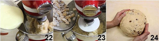 Por último, añade la mantequilla derretida tibia poco a poco 22. En cuanto los ingredientes se hayan integrado, quita la pala y coloca el gancho, luego amasa durante unos 10 minutos hasta que la masa esté homogénea y completamente adherida al gancho. Añade las almendras picadas (frías) luego las pasas y la naranja confitada enharinadas 23 y amasa durante un par de minutos. Coloca la masa sobre una tabla, dándole forma redonda 24.