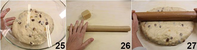 Luego colócala en un bol grande, cubre con film transparente y deja fermentar durante una hora en un lugar cálido 25. Mientras tanto, toma el mazapán y dale forma cilíndrica 26. Transcurrido el tiempo de fermentación, coloca la masa sobre una tabla, dándole forma rectangular y con el rodillo aplana en el centro, alargando un poco la masa para obtener en los lados más largos un abultamiento más grueso que el otro 27.