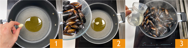 Para preparar los strozzapreti cacio mejillones y pimienta, calienta en una sartén un chorro de aceite de oliva virgen extra con un diente de ajo 1. Añade los mejillones 2, sube el fuego y añade el vino 3, luego deja evaporar la parte alcohólica.